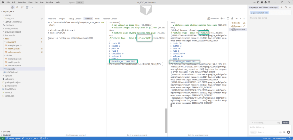 It worked. The agent produced the failing tests, explained why they failed, I corrected the app behaviour, and a clean re-run confirmed the fixes.
