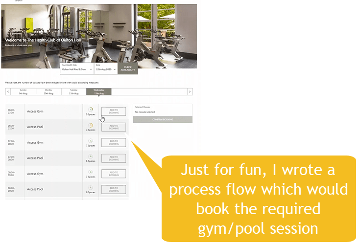 As a result of Coronavirus restrictions, my local gym introduced a pre-booking policy. Members could book either a gym or a pool session up to 7 days in advance. I thought it would be fun to write a robot to automate this booking process.