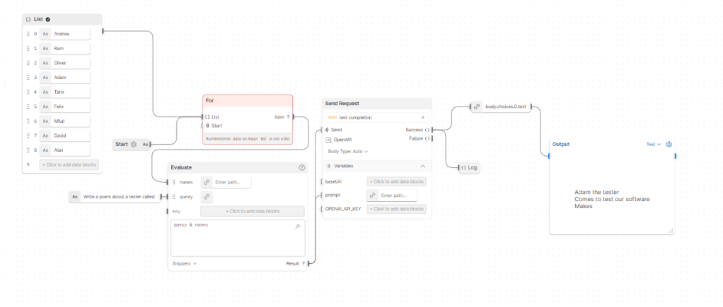 *Updated March 2023* If you want to loop through a response and apply a rule to it then you can find an example picture below. Here I define a list of names, and using a FOR loop take each name, do something with it in the Evaluate block (combine a string + the name) then output that response to a Send Request block. I have asked OpenAI to generate a poem about a tester, and output this to the log, and also an output block.