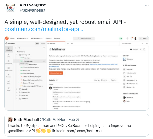 - Created Mailinator’s first public API in Postman, including a “run in Postman” button to easily get up and running.