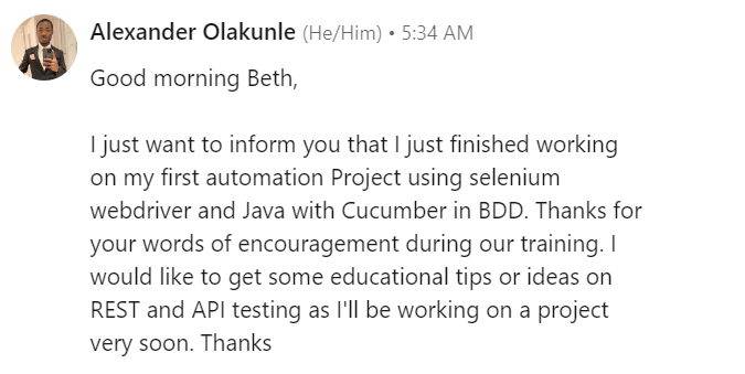 Today I got a message from Coders Guild software testing graduate Alexander Olakunle, who I have to say I found to be a very dedicated and driven person, who has worked incredibly hard on the course and landed his first testing job with Ordinance Survey (congrats again Alexander!). He asks:-