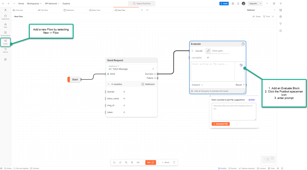 You can find the Postbot for Flows by selecting an Evaluate block and adding it to a Flow. When you click the purple Flows icon, you can enter your prompt.