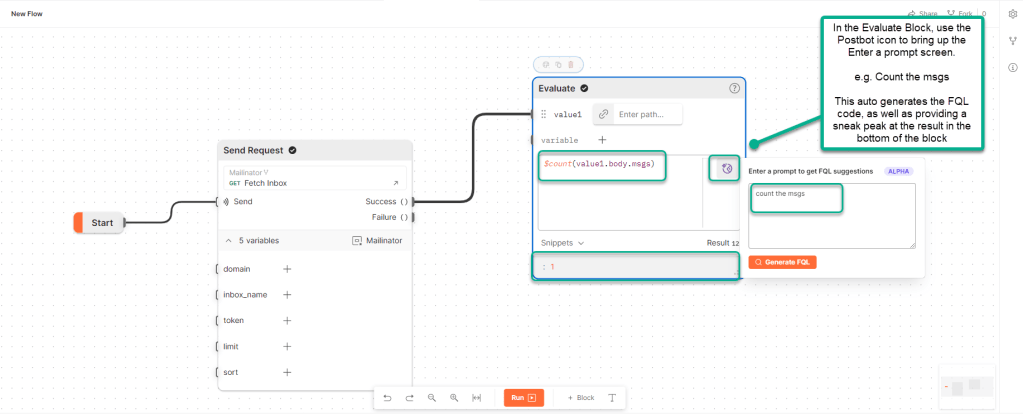 This Postbot can help you with the coding side of things. Instead of learning Flows Query Language, you can try prompting Postbot to write an evaluation query for you. Moving you one step closer to no/low code implementation, even for more complex queries.
