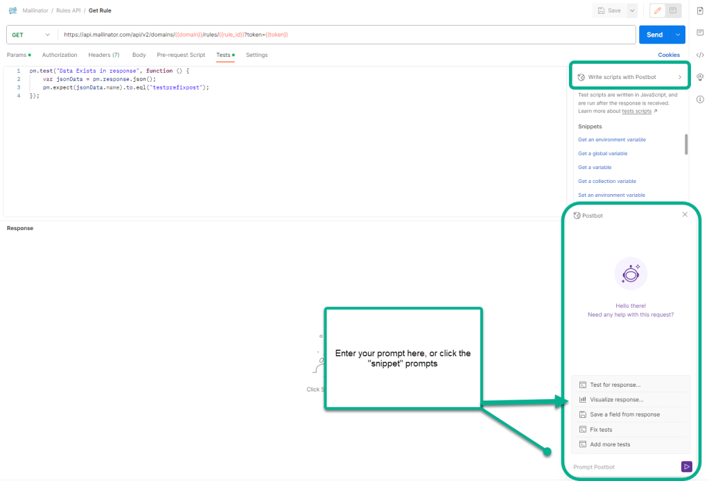 You’ll find Postbot where the snippets live, within the Tests tab for an individual request.