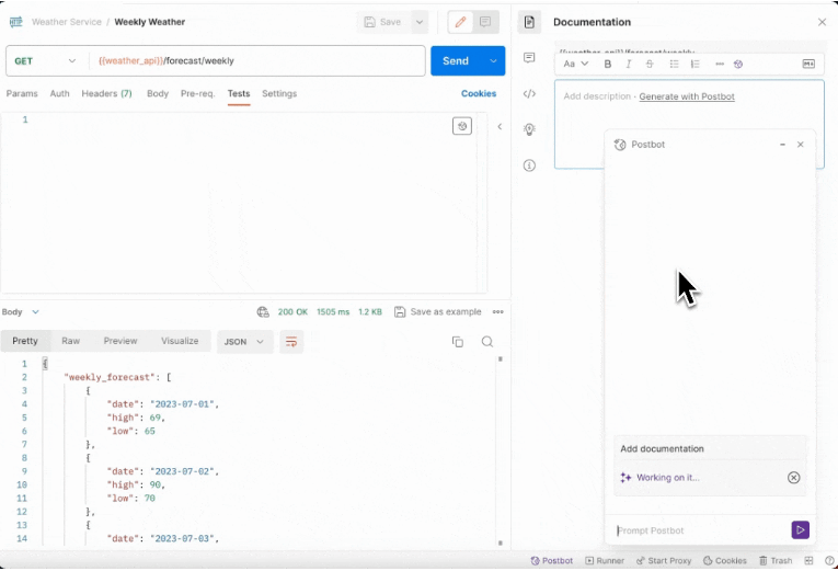This Postbot can take the task that so many API developers struggle to complete, one of the most common complaints people have when trying to consume an API: Documentation. It can read your API and generate useful documentation – or at least a draft which has done a lot of the heavy lifting that you can review and make tweaks to. A lot easier than starting from scratch, no?