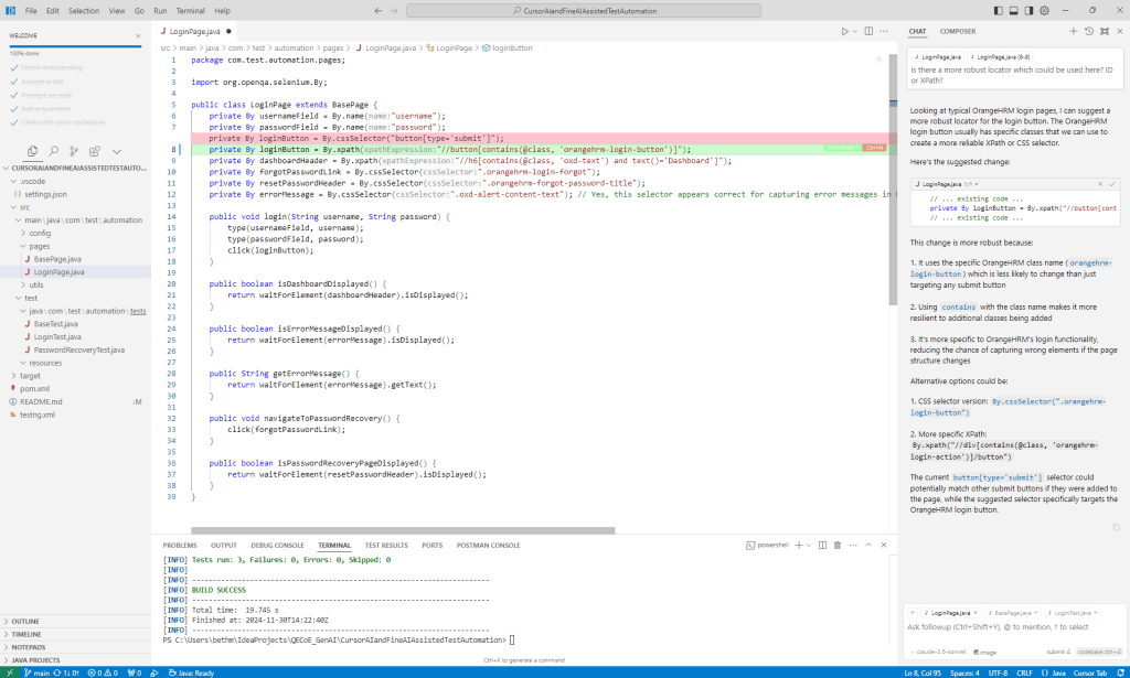 - WebElement locator strategy was not ideal – css chosen by default (this could easily be tweaked with a prompt)